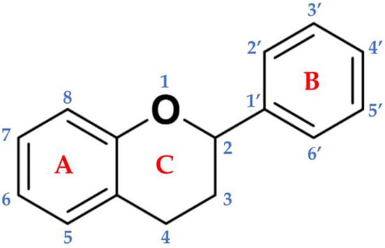 Flavonoids are a subgroup of secondary metabolites belonging to a large collection of phenolic compounds synthesized by plants. They are widely distributed among photosynthetic organisms, and are abundant in foods and beverages of plant origin (Table 1), where qualitative and quantitative compositions can vary considerably. The chemical structure is composed of a skeleton with 15 carbon atoms, containing two benzene rings (A and B) linked to the heterocyclic pyranic ring (C) [2]. Flavonoids can be divided into several subgroups: flavones, flavonols, flavanones, flavanonols, flavanols or catechins, anthocyanins, and chalcones [3]. This distinction is derived from the basic structure of the flavonoid (Figure 1), the flavone ring, which represents the main part of the flavonoid and the degree of unsaturation and oxidation of the carbonaceous ring. Furthermore, in plants, the aglycone is the basic flavonoid structure; however, methyl ethers and acetyl esters of the alcohol group may be present, as well as glycosides formed through linkage with a carbohydrate, such as l-rhamnose, d-glucose, glucose-rhamnose, galactose, or arabinose [4].