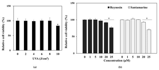 Effect of UVA (a) and reynosin and santamarine (b) on the viability of human derma fibroblasts (HDFs). Viability of the cells was measured after 24 h treatment with MTT assay. Viability was given as relative percentage of the untreated group. Values are means ± SD (n = 3). * p < 0.05, vs. untreated control.
