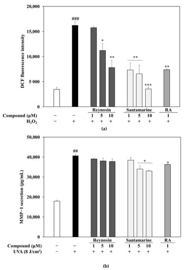 The antioxidative capabilities of reynosin and santamarine were confirmed in HDFs using DCFH-DA fluorescent assay. As seen in Figure 3a, both reynosin and santamarine showed dose-dependent radical scavenging activity. Santamarine and reynosin decreased the ROS activity in HDFs with IC50 value of 4.04 and 11.28 µM, respectively.