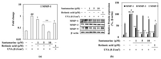 Effect of santamarine on the mRNA expression of MMP-1 (a) and the protein levels of MMP-1, MMP-3 and MMP-9 (b) analyzed by RT-qPCR and Western blot, respectively. UVA-irradiated (8 J/cm2) HDFs were treated with santamarine for 24 h and the harvested cells were used to measure the MMP levels. β-actin was used as a loading control. Values are means ± SD (n = 3). * p < 0.05 and ** p < 0.01 vs. UVA-irradiated untreated control. # p < 0.05 and ## p < 0.01 vs. non-irradiated control. Retinoic acid was used positive control.