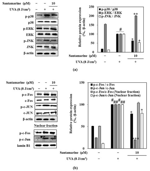 Effect of santamarine on the MAPK/AP-1 pathway activation. UVA-irradiated (8 J/cm2) HDFs were treated with santamarine for 24 h and the harvested cells were used to measure the total and phosphorylated levels of (a) p38, ERK and JNK MAPKs, and (b) c-Fos and c-Jun of AP-1 complex via Western blot. β-actin and lamin B1 were used as loading controls. * p < 0.05, ** p < 0.01 and *** p < 0.001 vs. UVA-irradiated untreated control. # p < 0.05 and ## p < 0.01 vs. non-irradiated control.