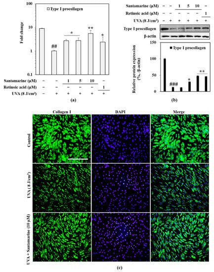 Effect of santamarine on the collagen production in UVA-irradiated (8 J/cm2) HDFs. Effect of santamarine on the mRNA expression (a) and protein level (b) of type I procollagen was analyzed after 24 h treatment post-UVA-irradiation via RT-qPCR and Western blot, respectively. β-actin was used as a loading control. Values are means ± SD (n = 3). (c) Fluorescence-stained images of the HDFs were taken after staining with FITC conjugated anti-collagen I antibody (green) and DAPI (blue) to highlight the nuclei. Scale bar, 100 μm. * p < 0.05 and ** p < 0.01 vs. UVA-irradiated untreated control. ## p < 0.01 and ### p < 0.001 vs. non-irradiated control. Retinoic acid was used as positive control.
