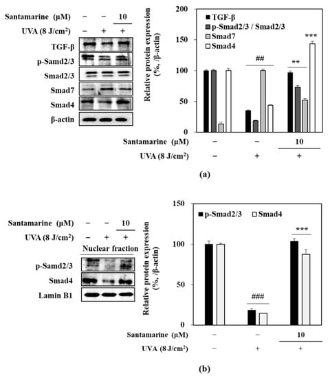 Effect of santamarine on TGF-β/Smad pathway activation. Total cell (a) and nuclear (b) levels of phosphorylated (p-) and total TGF-β/Smad signaling proteins were analyzed after 24 h treatment in UVA-irradiated (8 J/cm2) HDFs via Western blot. β-actin and lamin B1 were used as loading controls. ** p < 0.01 and *** p < 0.001 vs. UVA-irradiated untreated control. ## p < 0.01 and ### p < 0.001 vs. non-irradiated control.