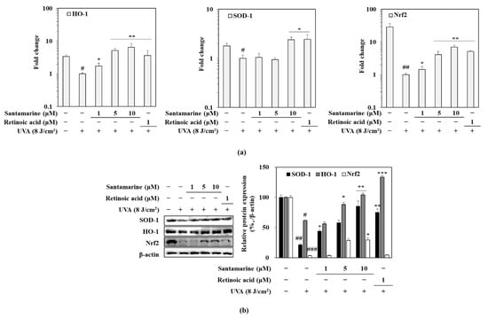 Effect of santamarine on Nrf2-dependent intracellular antioxidant mechanism. The mRNA expression (a) and total protein levels (b) of Nrf2 and dependent antioxidant enzymes SOD-1 and HO-1 were analyzed using RT-qPCR and Western blot, respectively, after 24 h treatment in UVA-irradiated (8 J/cm2) HDFs. β-actin was used as a loading control. Values are means ± SD (n = 3). * p < 0.05, ** p < 0.01 and *** p < 0.001 vs. UVA-irradiated untreated control. # p < 0.05, ## p < 0.01 and ### p < 0.001 vs. non-irradiated control. Retinoic acid was used as a positive control.