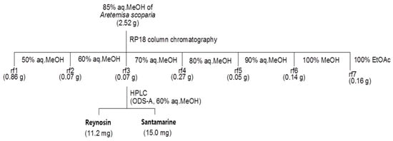 Isolation scheme of reynosin and santamarine from A. scoparia crude extract 85% aq. MeOH solvent fraction.
