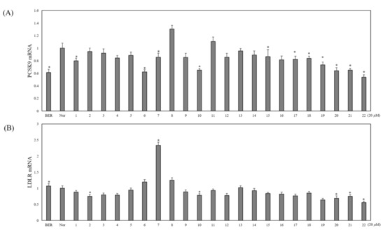 Effects of compounds 1−22 and berberine·HCl (BER) on PCSK9 and LDLR regulation in the HepG2 human hepatocellular liver carcinoma cell line. The mRNA expressions of PCSK9 (A) and LDLR (B) were assayed by qRT-PCR in cells treated with compounds 1−22 for 24 h. * p < 0.05.
