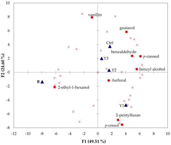 Principal component analysis diagram of vanilla pods supplemented with different microorganism treatments. ▲: Samples (ctrl: Standard procedure; Y1: D. bruxellensis; Y2: S. crataegensis; Y3: C. cacaoi; B: B. subtilis). ●: Labeled volatile compounds. ○: Unlabeled volatile compounds.