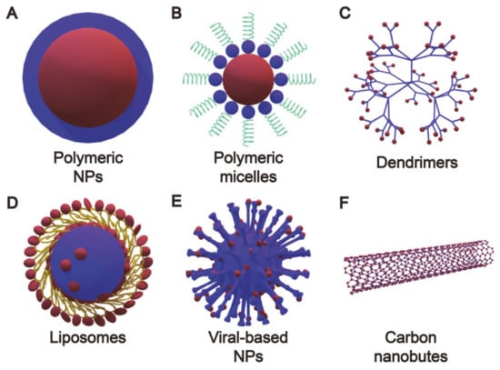 Cancer remains one of the biggest “first killer” diseases in the world [1,2,3]. Currently, clinical cancer treatment involves surgery, chemotherapy, and radiotherapy [4,5,6]. As a local therapy, there are difficulties using surgical treatment to eliminate infiltrating and metastatic tumors, while chemotherapy often results in serious side effects, including organ damage, nausea, vomiting, leukopenia, and anemia, as well as limited drug accumulation in deep tumors that can lead to drug resistance after repeated treatment [7,8,9]. Recently, methods to minimize the side effects of chemotherapy on normal tissues have attracted widespread attention [10,11,12,13]. Multifunctional drug delivery systems (DDSs) act as drug carriers that are designed to deliver a sufficient dose of a drug to the tumor area at the required rate, and are widely used today [9,14,15]. DDSs can effectively prolong the circulation time of drugs in the body, while reducing side effects and increasing the accumulation of drugs at the tumor site through infiltration of the tumor interstitial tissue from leaky vasculature [16,17]. Drug carriers are essential to obtain good therapeutic effects, prolong blood circulation time, improve loading efficiency, and control release capabilities [18]. Therefore, the most important feature for drug carriers is excellent biocompatibility, which refers to the ability of tissues to react to inactive materials, and generally refers to the compatibility between the material and the host. Good biocompatibility is also conducive to a material’s applications in biomedicine. There are many types of drug carriers in a drug delivery system, including (1) polymeric nanoparticles, (2) polymeric micelles, (3) dendrimers, (4) lipid-based drug carriers, (5) viral nanoparticles, and (6) carbon nanotubes (Figure 1) [19].