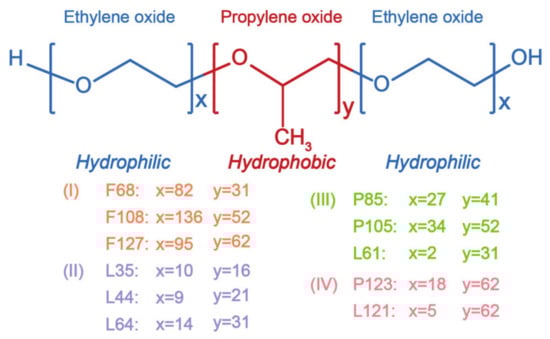 As the degree of polymerization increases, the state of pluronic polymers ranges from liquid to semi-solid to waxy solid. Pluronics can be divided into four categories according to differences in their hydrophilic-lipophilic balance (HLB) and PPO chain length (Figure 2): (I) HLB 20–29 hydrophilic pluronics, such as pluronic F68, pluronic F108, and pluronic F127 [52,53,54]; (II) pluronics with a HLB < 20 and PPO chain < 30, such as pluronic L35, pluronic L44, and pluronic L64 [55,56,57]; (III) pluronics with a HLB < 20 and PPO chain of 30–60, such as pluronic P85, pluronic P105, and pluronic L61 [58,59,60]; (IV) pluronics with a HLB < 20 and a PPO chain > 60, such as pluronic P123 and pluronic L121 [50,61].