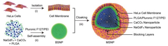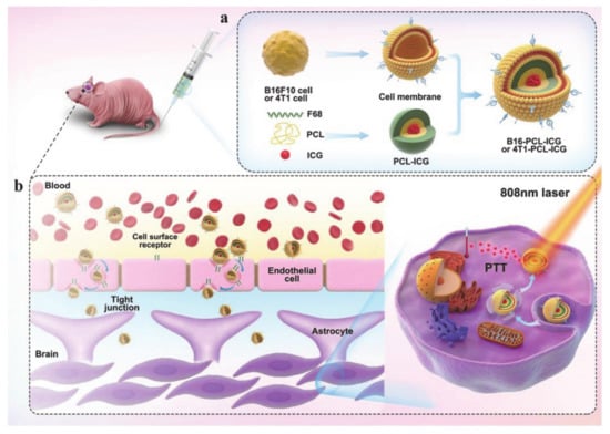 Wang et al. [68] designed a bionic nanocarrier based on the cell membrane of brain metastases, which could be used for imaging and photothermal therapy (PTT) (Figure 5). The biomimetic nanocarrier consists of two components: the core is made of polymer nanoparticles (NPs) loaded with indocyanine green (ICG) prepared from polycaprolactone (PCL) and pluronic copolymer F68, which functions as an imaging agent and a photothermal agent, while the shell is a brain metastatic tumor cell membrane extracted from a cancer cell. The amphiphilic F68 is used to wrap the ICG and give it hydrophilicity, so that it can be smoothly encapsulated by the cell membrane. The F68 forms nanoparticles via self-assembly in water, which enhances solubility, biocompatibility, and easy transportation. The entry and exit of brain materials is controlled by the blood-brain barrier (BBB), so a large number of drugs are excluded from the brain, making it difficult to treat brain tumors. However, by mimicking the source cells, biomimetic nanocarriers help to enhance the permeability of the BBB, prolong drug circulation time, and facilitate the accumulation of drugs in tumors. Hence, nanoparticles constructed by using brain metastatic tumor cell membrane as a camouflage have a higher ability to cross the BBB and destroy the BBB, thereby allowing for fluorescence imaging and PTT treatment of early brain tumors. In conclusion, pluronic-based drug delivery systems have many bioimaging applications and represent useful candidates for radiation-responsive cancer treatment.