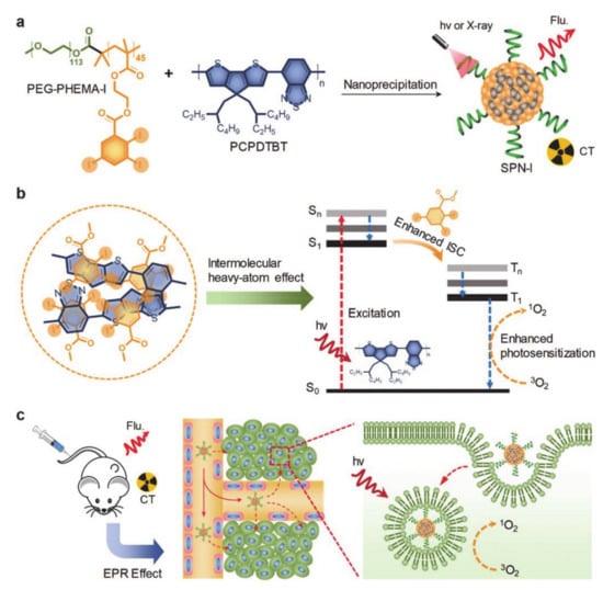 Zhou et al. [69] designed an iodine-rich SPN-based nanotheranostic (SPN-I) for photodynamic therapy (PDT). The near-infrared (NIR) absorbing semiconducting polymer (PCPDTBT) and F127 encapsulated by the iodine grafted amphiphilic copolymer (PEG-PHEMA-I) were co-precipitated to obtain SPN-1 nanoparticles (Figure 6a). Among them, PCPDTBT was used as the source of the NIR fluorescence signal and photosensitizer. Moreover, the iodine in the PEG-PHEMA-I can be used not only to provide a high X-ray attenuation coefficient, but can also be applied to cause an intramolecular and intermolecular heavy atom effect (HAE), thereby increasing the intersystem crossing (ISC) rate and inducing more ROS generation, which in turn increases the 1O2 quantum yield (Figure 6b). F127 is suitable for the formation of uniform nanoparticles and improves biocompatibility. Figure 6c shows the mechanism of SPN-I for computed tomography (CT) and fluorescence double-peak imaging. It has the advantages of good stability, deep tissue penetration, and high sensitivity. In short, the introduction of iodine in this review could greatly improve the efficiency of PDT and tumor suppression without increasing side effects.