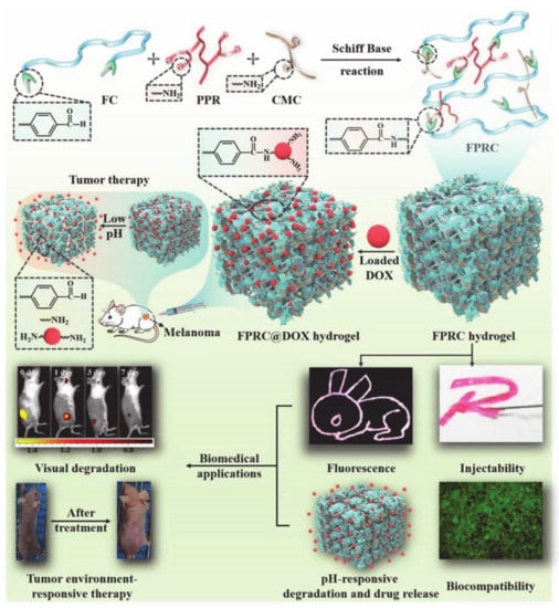 The synthesis process of multifunctional FPRC hydrogel and the effective application of FPRC@DOX hydrogel in treatment (reproduced with permission from Wang et al. 2020 [70]. Copyright @2020 Elsevier Ltd.).