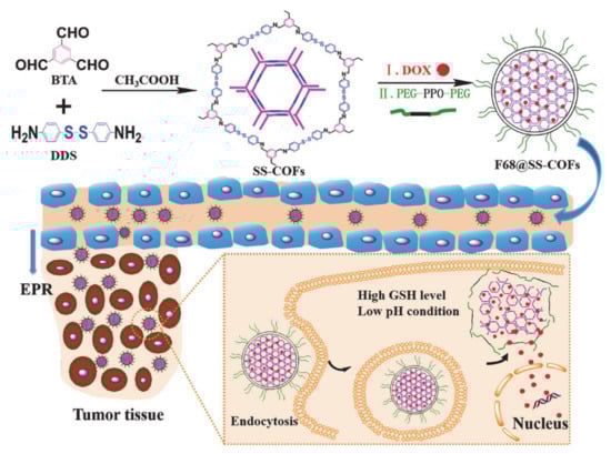 Liu et al. [71] designed and synthesized a pluronic F68 encapsulated PEGylated redox-responsive nano-scale covalent organic framework (COF denoted as F68@SS-COF) for efficient loading and delivery of DOX (Figure 8). F68@SS-COF was prepared via self-assembly of pluronic F68 and COF with disulfide bonds derived from the universal Schiff base reaction between disulfide bonds. Then, DOX was effectively encapsulated through hydrophobic interaction and π-π stacking interaction, which is attributed to the large pore surface area of COF that can achieve high drug loading and good biocompatibility. At the same time, disulfide bonds make it responsive to GSH over-expression in tumor cells, thereby effectively releasing DOX to kill tumor cells and achieving a high loading rate and very low premature leakage. In addition, F68 can not only be used to enhance the stability of nanoparticles, it can also improve the uncontrolled size of COF, dissociation caused by dilution, and premature drug leakage. Moreover, the PEG chain of F68 has the effect of increasing stability and prolonging blood circulation. This strategy represents an excellent option for tumor treatment with redox responsiveness.