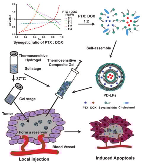 Fu et al. [72] designed and prepared a multi-drug loaded liposomes system (PD-LPs) by encapsulating PTX and DOX in liposomes at an optimal ratio, and combining them with a heat-sensitive hydrogel (Gel) which was composing of pluronic F127, sodium alginate (SA), and hydroxypropyl methylcellulose (HPMC) to prepare the PD-LPs Gel (Figure 9). However, the poor solubility of PTX and the strong cytotoxicity of DOX limits the application of this system in tumor areas. In addition, the synergy of PTX and DOX did not have cross-resistance and was seen to induce mitochondrial apoptosis. Therefore, the introduction of a pluronic polymer allowed it to act as not only a drug carrier, but also resulted in an enhanced EPR effect and increased accumulation in tumor areas. Moreover, F127 was applied to heat-sensitive gels in this system, which allowed it to target tumors and maintain drug concentration. The PD-LPs Gel can maintain effective drug concentration at the tumor site by forming a reservoir at the tumor, and has excellent biocompatibility and drug targeting. This thermosensitive nanocomposite gel could increase the concentration of the drug, prolong the retention time of the drug at the tumor area, has low systemic toxicity, and achieves commendable therapeutic effects.