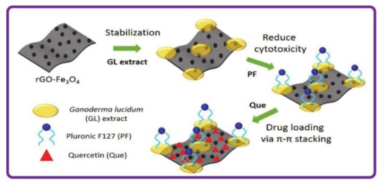 Lee et al. [73] designed and synthesized superparamagnetic graphene-based magnetite nanocomposites (rGO-Fe3O4) for targeted drug delivery, and used Ganoderma lucidum extract (GL) to stabilize rGO-Fe3O4, improving the water dispersion and stability of the nanocomposite. The introduction of pluronic F127 (PF) not only gave the composite materials a wider range of biological applications, but also reduced the overall cytotoxicity and improved biocompatibility (Figure 10). The nanomaterial was then used to encapsulate the natural anticancer drug Quercetin (Que) through π-π stacking and hydrophobic interaction to obtain rGO-Fe3O4-GL-PF. The Fe3O4 has low toxicity and superparamagnetic properties, so it can be used for targeted drug delivery. In addition, the introduction of GL could improve the stability of rGO-Fe3O4 and the agglomeration of nanoparticles. Overall, rGO-Fe3O4-GL-PF represents a potential tumor-targeting drug carrier with magnetic responsiveness.