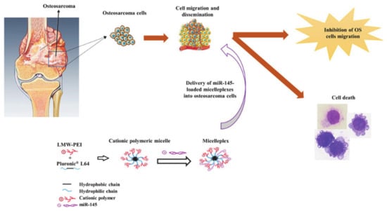 Today, gene therapy is an innovative option for the treatment of osteosarcoma (OS). It involves the transfer of genetic material through a nano system to inhibit or replace the expression of mutant genes. The introduction of miR-145 inhibits cell proliferation and migration, thereby inducing tumor cell apoptosis. Magalhães et al. [75] developed a type of nanosystem (L64-PEI) and used it to deliver miR-145 to obtain micellar complexes (L64-PEI/miR-145) (Figure 11). Among them, pluronic L64 endowed the nanostructure with the ability to self-assemble in an aqueous medium, and had a more suitable size and a more stable structure. In addition, the hydrophilic shell of L64 allowed it to avoid non-specific capture by the reticuloendothelial system and thus resulted in higher bioavailability and better biocompatibility. Moreover, PEI helped to increase cellular uptake through the endocytic pathway. In short, pluronic-based drug delivery systems allow the effective transport of genetic material to promote apoptosis and necrosis of cancer cells, which provides new options for gene therapy.