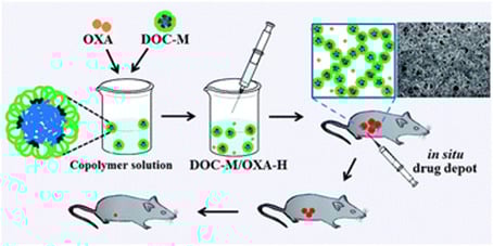 Li et al. [77] designed a drug delivery system (DOC-M/OXA-H), which was prepared with block copolymer PLLA-L35-PLLA to form a thermosensitive gel (Figure 12). The DOC-M/OXA-H system consists of docetaxel-loaded micelles (DOC-M) and oxaliplatin-loaded hydrogels (OXA-H). DOC is a hydrophobic anticancer drug that can be loaded onto copolymer micelles. At the same time, OXA-H not only confers anti-tumor effects, it also gives micelles the ability to change phase with temperature. DOC-M/OXA-H transforms into a solid gel at physiological temperature through a flowable sol in the environment, and can be used as a drug reservoir to achieve a high curative effect and synergistic drug treatment. The L35 pluronic not only improved the bioavailability and blood circulation time of the gel, but also reduced systemic toxicity, thereby enhancing the effective killing of tumors and resulting in better safety. Clearly, the polymeric drug delivery system based on this pluronic presents a new strategy for the treatment of colon cancer as a controlled dual drug delivery system that forms a gel.