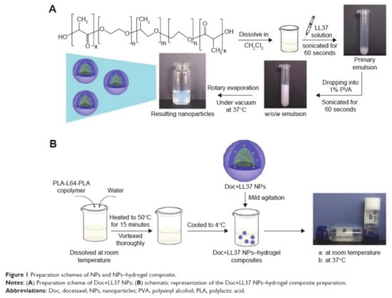 Schematic diagram of the preparation scheme of (A) NPs and (B) NPs-hydrogel composites (reproduced with permission from Fan et al. 2015 [78]. Copyright @2015 Dove Medical Press).