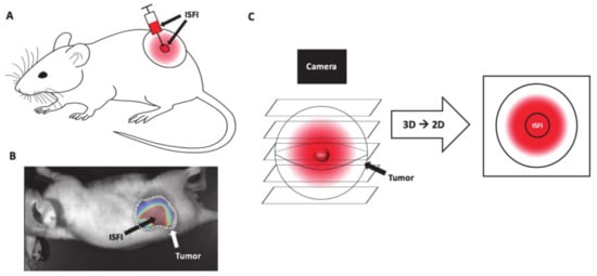 (A) Intratumoral ISFI injection into a subcutaneous murine tumor. (B) Intratumoral Dox loaded ISFI (red) fuorescent image. (C) Schematic of Dox distribution above and below ISFI (reproduced with permission from Jeganathan et al. 2020 [83]. Copyright @2020 The Author(s)).