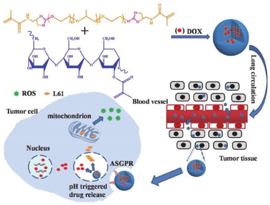 Zheng et al. [84] designed a series of pH-responsive nanogels that are formed by crosslinking natural polymers with orthoester-based crosslinking agents (Figure 16). The authors prepared two kinds of nanogels with a methacrylated pullulan (Pullulan-M), crosslinking agent, acid-insensitive methacrylated copolymer (L61-M), or acid-labile orthoester modified pluronic polymer (L61-MOE). Pul-L61-MOE, which was sensitive to pH, showed a time-dependent degradation and a high drug release rate. In addition, the endocytosis mediated by the lectin asialoglycoprotein receptor (ASGPR) allows for easy entry into tumor cells and actively targets DOX. Pluronic L61 not only endows the nanogel with good biocompatibility, but also has a long blood circulation time and does not damage normal tissues. Moreover, L61 can be used to target mitochondria inducing ROS production, thereby achieving a synergistic anti-tumor effect with DOX targeted therapy. With all this in mind, the polymeric drug delivery system based on pluronic polymers shows excellent potential for use in pH-responsive nanogels and targeted tumor therapy.