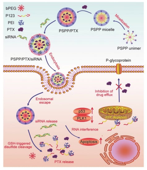 Scheme of the codelivery of siRNA and PTX mediated by PSPP micelles (reproduced with permission from Wang et al. 2017 [87]. Copyright @2017 WILEY-VCH).