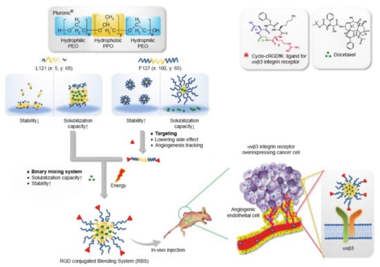 Lim et al. [89] designed and developed a hybrid system based on pluronic polymer L121/F127 loaded with the anticancer drug docetaxel (DTX) to targeted tumors for treatment (Figure 19). Cyclic arginine-glycine-aspartate tripeptide (cRGD) is an active tumor targeting ligand that was conjugated to nanoparticles and provides several benefits, including its ability to increase cellular uptake in cancer cells, increase anti-cancer activity, and aid in effective drug accumulation, resulting from the binding of cRGD to proteins that are overexpressed in tumor tissues. Among them, the L121/F127 blending system helped to obtain a suitable size and better colloidal stability. Pluronic L121/F127 could be used to load more hydrophobic drugs by forming a more suitable size. In addition, it could also be applied to help improve colloidal stability. In short, pluronic-based polymer drug delivery systems are expected to encapsulate various drugs by changing the proportion of polymer blends, and have great potential for improving anti-tumor activity.