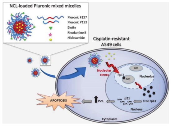 Russo et al. [90] developed a pluronic multifunctional platform P123/F127 mixed micelle for delivering niclosamide (NCL) to targeted cancer cells (Figure 20). NCL overcame MDR by inhibiting the efflux of ATP, thereby effectively inhibiting cell growth. F127 was conjugated with biotin for internalization, which was targeted to cancer cells with negligible systemic toxicity. Rhodamine B modified in P123 was used to label micelles to achieve cell imaging. Moreover, the self-assembly of P123/F127 into micelles can be used to enhance the solubility and biocompatibility of NCL. In addition, P123/F127 can also provide small nanostructures that are applied to prolong drug circulation time and overcome the drug outflow of MDR, thus increasing drug accumulation. These pluronic-based drug delivery systems have great potential for use in the treatment of multi-drug resistant cancers and are expected to achieve the goal of targeted and sustained drug release.