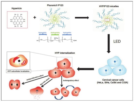 Damke et al. [91] developed micelles (HYP/P123) of pluronic P123 encapsulating hypericin (HYP) for PDT (Figure 21). As a natural photosensitizer (PS), HYP not only has anti-proliferation and cytotoxic effects, it also has high selectivity for tumors. However, the high hydrophobicity of HYP reduces the production of 1O2 and hinders the efficacy of PDT. P123 was introduced herein for the preparation of micelles in order to improve the poor solubility of HYP. The resulting mixture easily self-assembled to form micelles in an aqueous medium, and the inner core was used to load photosensitizer. In addition, P123 is non-toxic, and has good biocompatibility and excellent pharmacokinetics. HYP/P123 is selectively cytotoxic to cervical cancer cells with negligible systemic toxicity. Pluronic-based DDS is expected to become a platform for the treatment of all types of cervical cancer cells.