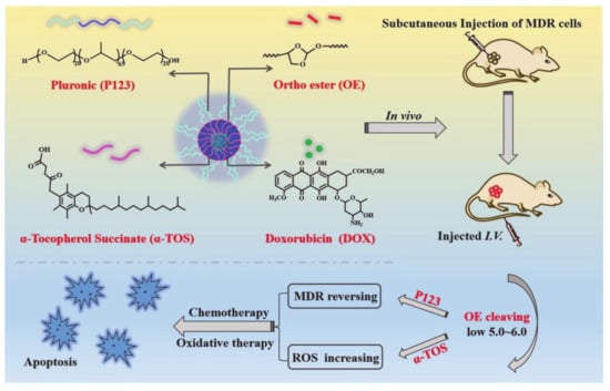 Cheng, et al. [92] designed a new type of pH-sensitive pluronic micelle that can not only be used for oxidative therapy, but can also reverse the synergistic effects of MDR, which hinders cancer treatment (Figure 22). Through the acid-labile orthoester (OE) bond, the orthoester in particular has better biocompatibility and stability. The authors also used α-tocopherol succinate (α-TOS) to synthesize modified pluronic (P123), which had the function of mediating drug outflow to significantly reverse MDR. At the same time, α-TOS can be used for solubilization to obtain a pH-sensitive copolymer (POT). POT micelles have acid-triggered sensitivity and can be used to target drug release in the tumor area and can also be used to reverse MDR and induce the generation of more reactive oxygen species (ROS). As a result, POT micelles have a good tumor inhibitory effect. This resulted in better stability and anti-hemodilution effect, and in the accumulation and retention of the drug in MDR cells, thereby increasing cytotoxicity and apoptosis when compared with traditional methods. These findings indicate that pluronic-based drug delivery systems can be effectively used for pH-sensitive cancer treatments that overcome MDR.