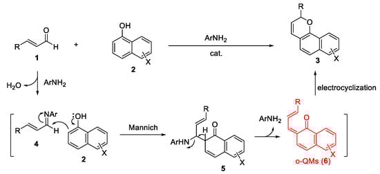 o-QM, a highly reactive intermediate originally harnessed in nature for various biological purposes [23], has been slowly recognized by synthetic organic chemists in organic synthesis [24,25,26,27,28,29]. Given the high reactivity of o-QMs, their in situ formation from the corresponding stable aromatic precursors by temporarily masking the “O” is generally carried out [24,25]. Therefore, an additional activation step is often required. In addition, the synthesis of the precursors is not trivial. We propose a new, more efficient catalytic approach for the in situ generation of o-QMs from readily accessible simple α, β-unsaturated aldehydes (enals) (Scheme 1). We envision that the direct functionalization of the aldehyde group of enals 1 with an amine catalyst gives imine 4. The reaction of 4 with 1-naphthol 2 via a Mannich-type leads to product 5, which serves as a precursor for a subsequent o-QM (6) formation by extrusion of the amine catalyst. Finally, an intramolecular cyclization reaction delivers benzopyrans, driven by re-aromatization.