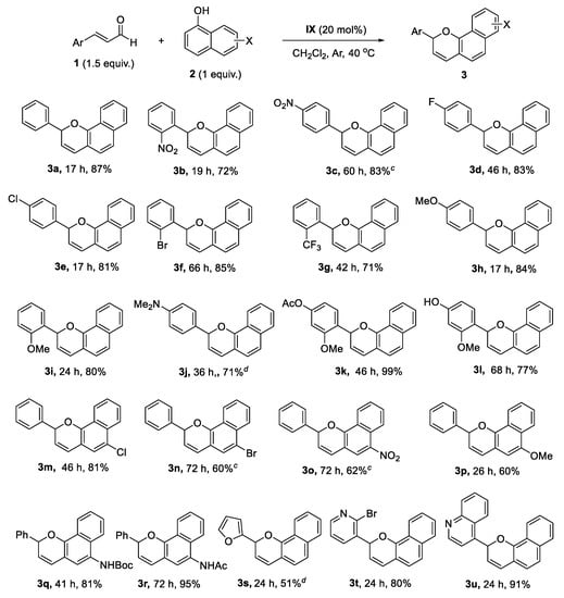 Scope of the arylamine-catalyzed Mannich–Friedel–Crafts cyclization cascade reactions of substituted trans-cinnamaldehyde (1a) with 1-naphthol (2a) a. a Unless stated otherwise, dry CH2Cl2 (1 mL) was added to the mixture of o-phenylenediamine (0.04 mmol), 1-naphthols (2, 0.20 mmol) and enal (1, 0.30 mmol). After the complete consumption of 1-naphthol, the crude mixture was purified via column chromatography. b isolated yield. c A 50-mg activated 4A MS powder was added. d The reaction was performed at room temperature.
