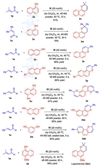 Since 2,2-disubstiuted-2H-chromenes are a common motif in many natural products and bioactive compounds and photochromic molecular devices, we made efforts toward their synthesis using this approach (Scheme 3). Gladly, 2,2-dimethyl-2H-benzo[h]chromene 3v was synthesized with a good yield of 61%. Similarly, when 3,3-diphenylacrylaldehyde was served as a substrate, the corresponding product 3w was obtained with a 78% yield. To further explore the versatility of this new synthetic strategy, reactions by employing 2-naphthols with enal 1 were performed. Both processes ran smoothly with good yields (3x and 3y). When 1,5-dihydroxynaphthalene was served as a substrate, a bis-cyclized product 3,9-diphenyl-3,9-dihydrochromeno[8,7-h]chromene (3z) was formed efficiently in a one-pot operation. Polyhydroxy resorcinol also led to the bis product 2,8-diphenyl-2H,8H-pyrano[2,3-f]chromene (3ab) in a good yield of 60% in a sealed tube at 60 °C. In contrast, when 2,7-dihydroxynaphthalene (2v), which also has two reaction sites, was employed, only mono-product 3aa was formed with an excellent yield of 95%. Finally, the method was demonstrated as a powerful approach for the efficient synthesis of natural product lapachenole (3ac) [34].