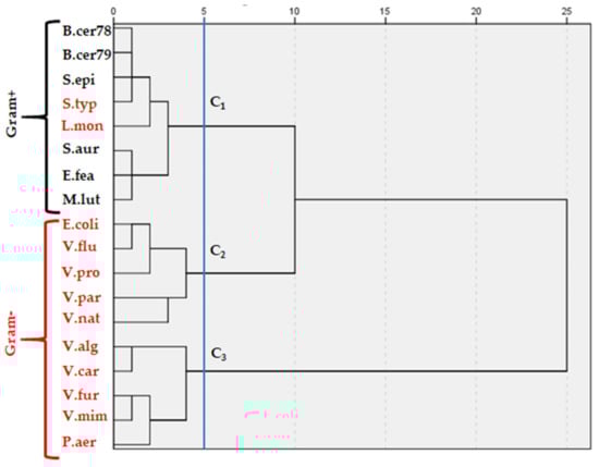 According to statistical analysis, means comparison of IZDs of all strains showed that Gram positive (Gram+) bacteria were more sensitive than Gram negative (Gram−). Moreover, the HCA (Figure 1) of these bacterial strains (Gram+ and Gram−), according to their responses to all EOs, based on the MIC and MBC values, allowed us to classify these stains on three clusters. The first one (C1) regroups all Gram+ bacteria, specifically S. typhimurium and L. monocytogenes, that reveal a similarity in their response against the assessed EO. Gram-strains, meanwhile, were clustered in two groups, C2 and C3, and according to the Ward clustering method C2 was found to be more related to C1 than C3.