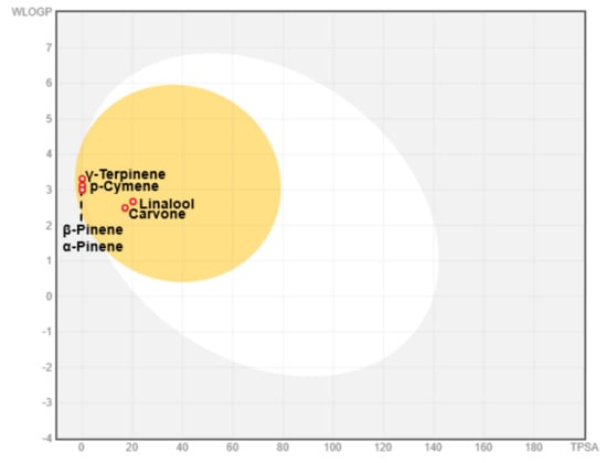 The pharmacokinetic profile of the major identified compounds defines their absorption, distribution, metabolism, excretion, and toxicity (ADMET) properties, which will be carefully considered in the early stages of drug development, leading to a significant reduction in the number of compounds that failed in clinical trials. The data depicted in Table 8 outlined that log BB values were in the range of 0.818 to 0.478 for all components, indicating their ability to penetrate the blood-brain barrier moderately and the fact that they will be highly distributed. They also manifested high Caco-2 permeability expressed by log Papp values > 0.90 cm/s. The volume of distribution (VDss) gives an indication about the circulation of a medicine at an equal level of blood plasma. Results showed that amongst the tested compounds, only α-pinene, β-pinene and linalool exhibited VDss values >0.45, suggesting that they may be more distributed in tissue rather than plasma. All tested compounds were predicted not to be a substrate or inhibitor of the human cytochrome P450 (CYP) isoforms (CYP2D6, CYP3A4, CYP1A2, CYP2C19, CYP2C9, CYP2D6 and CYP3A4), which are involved in drug metabolism. The transfer of a candidate compound by OCT2 gives useful information concerning its clearance, as well its potential contraindications. None of them are OCT2 substrates. The toxicity profile including AMES test, the human ether-a-go-go related gene (hERG), hepatotoxicity, and skin sensitization revealed that the selected identified compounds do not have any toxicity (Table 8).