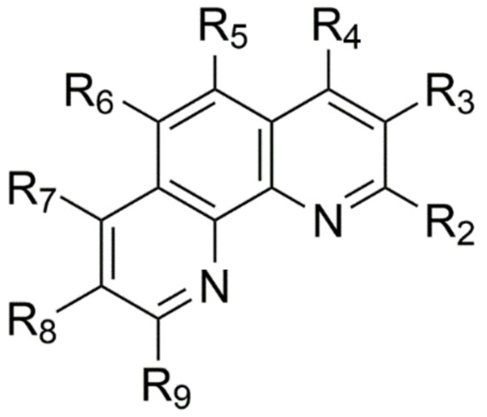 The time required for complete consumption of the substrate varied between 2 and 38 h (Table 2) depending on the substituents on phen. In order to obtain solid products, an aliquot of 2 M NaOH solution was added to the reaction mixture to set the pH between 9 and 10. Due to the pH change, the color of the solution turned into deep orange. Subsequently, the reaction mixture was extracted with appropriate amount of chloroform. Finally, the organic solvent was removed in a vacuum rotational evaporator. The color of the final products varied between yellow and purple depending on the substituent. The hydration of these dry materials led to a brownish color change.