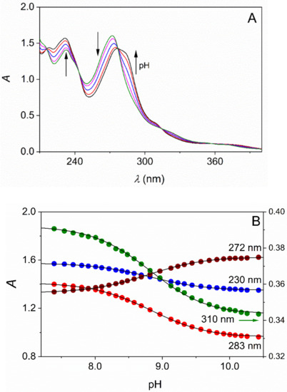 The compounds reported here typically feature intense absorption bands in the UV region with ε = 20,000–30,000 M−1cm−1. Thus, reliable spectrophotometric measurements are feasible in their dilute solutions at concentration levels as low as ~10–100 μM. Acidified solutions of L (ionic strength is set to the desired value) were titrated with standardized NaOH solution and the pH and the spectra were recorded. The absorbance data at 4–5 wavelengths were fitted simultaneously to Equation (2) (Figure 2).