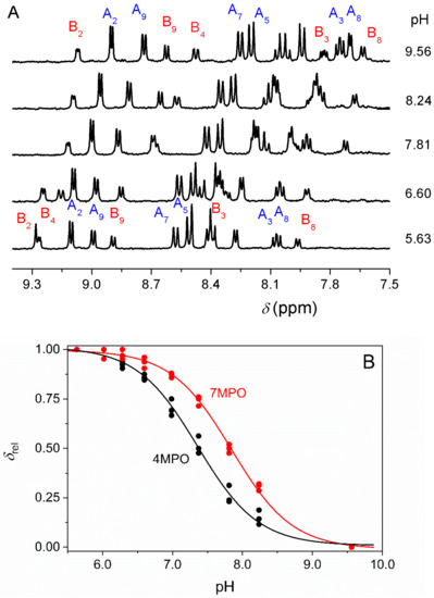 Some of the peaks overlap at a specific pH and cannot be used for calculating the pKa-s. Finally, the chemical shifts of three 4MPO (methyl, A2, A9) peaks, as well as three 7MPO (methyl, B2, B9) peaks, were fitted simultaneously to Equation (4).