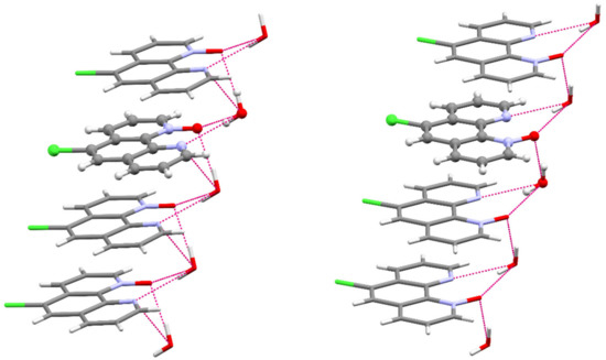 TMPO crystallizes in the triclinic crystal system space group (as 2,9-dimethyl-1,10-phenanthroline-1-N-oxide dihydrate [38]), the asymmetric unit contains two mono-N-oxides linked by hydrogen network of four water molecules as shown in Figure 5 and Figures S71 and S72.