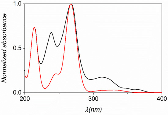 All spectra exhibit three or four characteristic absorption bands in the 200–400 nm wavelength range (Table S22). The most intensive band at 260–280 nm features the superposition of two transitions, which are due to a combination of excitations from occupied MOs with πarom character. The absorptions are mainly associated with the π-π* transitions of the aromatic system and the oscillator strengths are consistent with the experimental values of molar absorptivities. It is also noticeable, that neither the electron donating nor the electron withdrawing groups have significant effects on the energy of the main transition. This also confirms that the excitation is associated with the MOs bearing aromatic character.