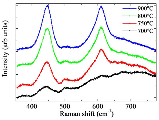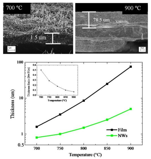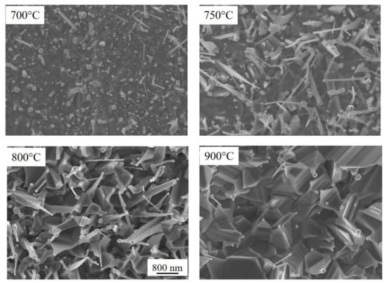 23]. The peaks’ intensities further increase as the temperature approaches 900 °C. This monotonic increase can be due to longer nanowires and higher film thickness as observed in