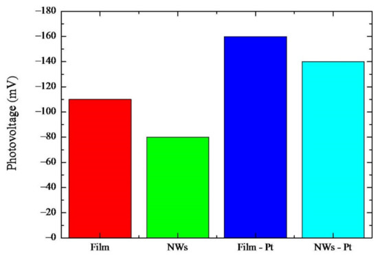 28]. Regarding the “NWs-Pt” sample in this case, an increase in the photovoltage, with respect to the sample, without Pt (“NWs”) was found. This sample (i.e., “NWs-Pt”) is very useful for evaluating the contribution of the two factors influencing the photovoltage, i.e., the nano-structuration and the Pt nanoparticles. Indeed, on one side, the nano-structuration is expected to increase the photovoltage, as described previously, whilst on the other, the Pt presence enhances the photovoltage. Finally, weighing these concomitant effects, the one given by the Pt layer proves to be predominant since the photovoltage for the “NWs-Pt” sample is slightly lower than the “Film” sample, where neither nano-structuration, nor Pt nanoparticles, are present.
