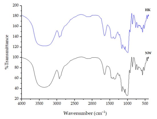 The FT-IR spectra of HK and NW starch samples are shown in Figure 3. The spectra showed peaks at around 3300 cm−1 (O-H stretching); 2900 cm−1 (C-H stretching); 1650 cm−1 (C-O associated with OH group); 1424 cm−1 (CH2 symmetric deformation); 1370 cm−1 (C-H symmetric bending); 1160 cm−1 (C-O-C asymmetric stretching); 1082 cm−1 and 1000 cm−1 (C-O stretching); and 930 cm−1, 860 cm−1, and 767 cm−1 (C-O-C ring vibration of carbohydrate). The FT-IR spectra obtained from this study were similar to those from a previous report [20].