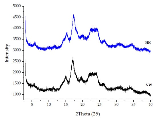 The crystallinity was measured by using an X-ray diffractometer (Malvern Panalytical, Malvern, UK) with a slightly modified version of the method used by Cheetham and Tao [34]. The HK and NW samples were packed tightly in aluminum cells then the intensities of samples were measured using the X-ray diffractometer with Cu Kα radiation (λ = 1.542), in the 3–40° 2θ range with a 0.01° step size and a measuring time of 10.0 s per point. The measurements were made at ambient temperature. The percentage crystallinity was calculated from the following equation [70].