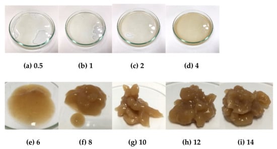 According to Mar et al. [44] the high degree of crystallinity is the cause of the high transition temperature values of starches, which provides structural stability and makes the starch granules more resistant to gelatinization. The higher percentage crystallinity of amylopectin requires the higher gelatinization enthalpy (ΔH) [45,46]. For the gelation method, the starch concentration was varied (0.5, 1, 2, 4, 6, 8, 10, 12, and 14% w/v) at different temperatures (55, 65, 75, and 80 °C) and it was found that all samples at temperatures lower than 80 °C with low concentrations (0.5–6% w/v) did not show gel formation and high concentrations (8–14% w/v), showed some of gel forming. At 80 °C, the gelation of HK and NW starches are shown in Figure 5 and Figure 6, they presented that the concentrations of 0.5 to 6% w/v showed some gel forming. At 8% w/v the starch presented the gel formation stage. The banana starch showed complete gel formation at 10 to 14% w/v. The results indicated that the gelatinization temperatures of HK and NW obtained from the DSC method were related to those found by the gelation method.