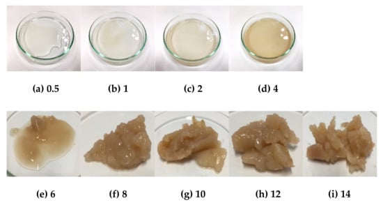 Gelation of HK banana starch at 80 °C at different concentrations where (a) 0.5% w/v, (b) 1% w/v, (c) 2% w/v, (d) 4% w/v, (e) 6% w/v, (f) 8% w/v, (g) 10% w/v, (h) 12% w/v, and (i) 14% w/v.