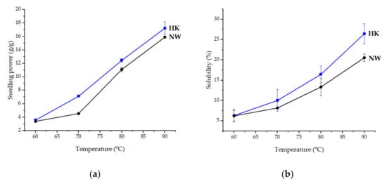 The swelling power and solubility of HK and NW were directly related to increases in temperature. Both HK and NW starches showed a two-stage process. The initial stage was in range of 60–70 °C where the starches exhibited low swelling, then a significant increase showed above 70 °C, which is in agreement with previous studies [48,49,50]. At temperatures above 70 °C, both HK and NW swelled rapidly until 90 °C (17.23 ± 0.94 g/g and 15.90 ± 0.15 g/g) that showed the highest swelling power (Figure 7a). During the initial stage, the starches exhibited slight swelling due to hydrogen bonds in the starch granules forming a complex of lipids and proteins that restricted swelling. At above 70 °C, the hydrogen bonds were disrupted and allowed water penetrated into the starch granules that increased swelling [51].