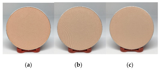 Body powder and compact powder containing HK or NW in a range of 5 to 20% were prepared. It was found that the products with a starch component in the range of 5 to 15% provided a smooth and soft touch similar to that of the base formulations whereas at higher than 15%, it has a less smooth and soft touch. The 15% HK and NW body powder showed a light-yellow color (Figure 8) with light banana odor. For 15% HK and NW compact powder, they showed a beige color (Figure 9) due to other colorants in the formula, with a light banana odor. It was found that when HK or NW starch was added into the formulation, it provided smoothness and could be used as a substitute for talcum powder. A sensory test in volunteers should be studied further. In addition, the flow properties of a body powder containing 15% HK and NW were similar to the base formulation (Table 3). From these results, the HK and NW starch has the potential to be used as a substitute for talcum in powder base preparation. However, the HK and NW starches needs to be modified to reduce their water absorption, which may improve the smoothness of product when use in higher quantities in powder formulation.