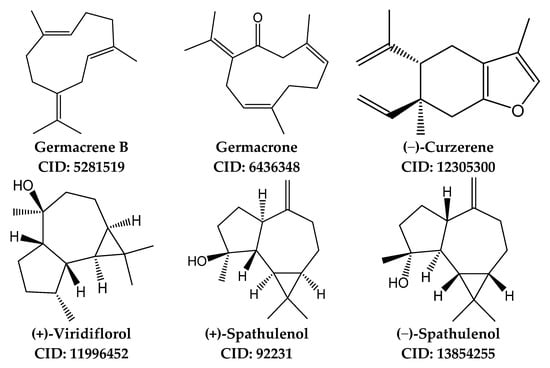 PharmMapper [43] was used for identifying putative protein targets for (−)-curzerene, (+) and (−) enantiomers of spathulenol, germacrene B, germacrone, and (+)-viridiflorol. For a given small molecule, PharmMapper recognizes potential target possibilities using an “invert” pharmacophore mapping methodology. In several reference databases that are incorporated in the software, the protein biotargets are represented by sets of pharmacophore points that provide faster mapping. The PubChem database (https://pubchem.ncbi.nlm.nih.gov; accessed 20 February2021) was used as a source of initial 3D structures for the investigated compounds. The structures of (−)-curzerene (CID: 12305300), (−)-spathulenol (CID: 13854255), (+)-spathulenol (CID: 92231), germacrene B (CID: 5281519), germacrone (CID: 6436348), and (+)-viridiflorol (CID: 11996452) were downloaded from PubChem in SDF format and further uploaded into PharmMapper. Up to 300 conformers of each compound were automatically generated using a corresponding option of the software. Pharmacophore mapping was performed with the “Human Protein Targets Only” database containing 2241 targets. The top 250 potential targets per compound were retrieved and sorted by the normalized fit score. The physicochemical properties of selected compounds were computed using SwissADME (http://www.swissadme.ch; accessed 25 February 2021) [44]. Structures of the main sesquiterpenes found in REOLv and used for molecular modeling are shown in Figure 1.