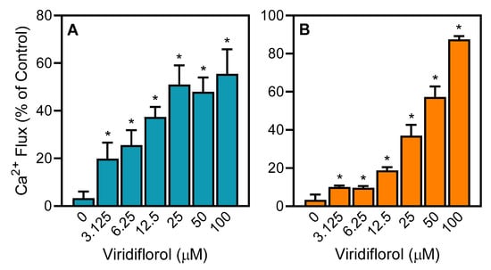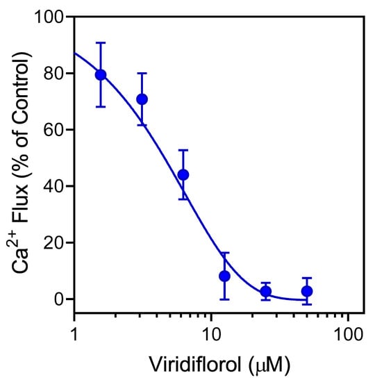 For all Ca2+ influx experiments, curve fitting (at least five or six points) and calculation of median effective concentration values (EC50 or IC50) were performed by nonlinear regression analysis of the dose–response curves generated using Prism 7 (GraphPad Software, Inc., San Diego, CA, USA).