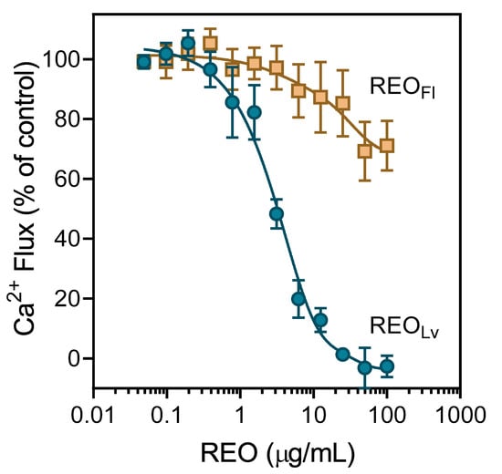In contrast to REOLv, REOFl had no effect on neutrophil or C20 microglial cell [Ca2+]i (Table 4). Similarly, β-phellandrene, which comprises 8.9% of REOFl, was also inactive in both of these cell types (Table 4). Previously, we analyzed a number of monoterpenes, including 12 compounds that we found here to comprise 77.8% of REOFl, for their ability to activate neutrophil Ca2+ influx. These compounds, including α-pinene, β-pinene, sabinene, myrcene, α-terpinene, limonene, (E/Z)-β-ocimene, γ-terpinene, p-cymene, terpinolene, linalool, and terpinen-4-ol, were all found previously to have no activating effects on neutrophil Ca2+ mobilization [29,31]. Thus, these previous studies together with our current results help to explain why REOFl is also inactive.